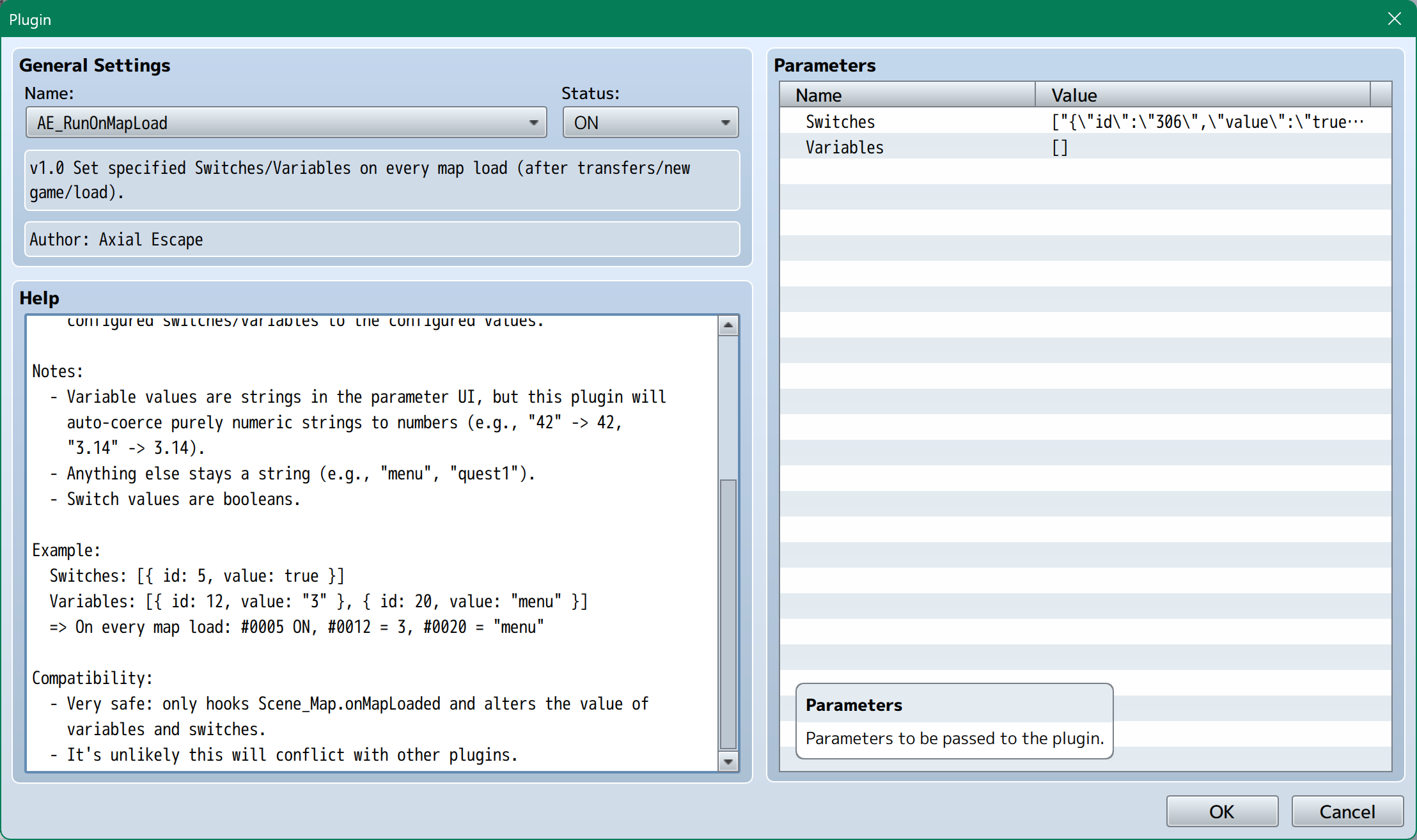 This plugin lets you change the value of switches and variables that you specify each time a map loads. This includes loading a save, starting a new game, and transferring map locations. This can be valuable for many reasons depending on how your project is configured; you may want to reset certain values every time the player changes maps.