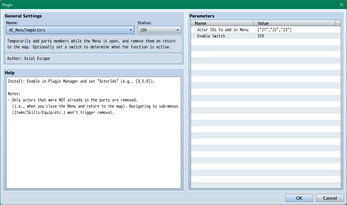 You can set which actors get added to the main menu, as well as a switch that must be turned on for the functionality of the plugin to take effect. If you leave the switch blank, the plugin will always be active.