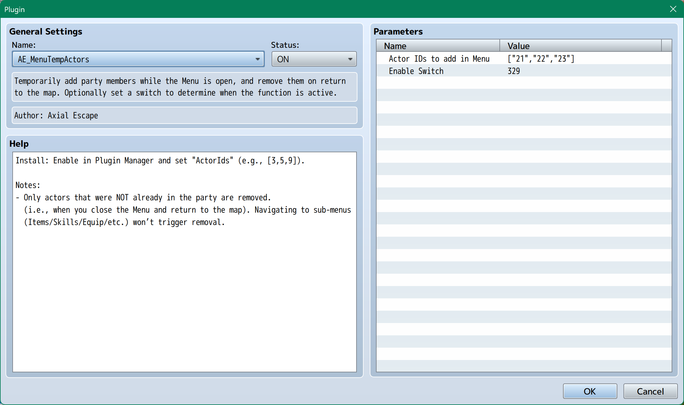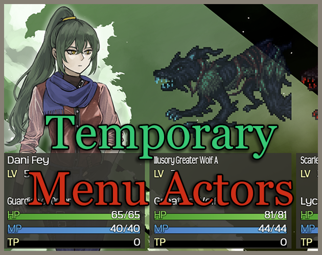 This plugin lets you temporarily add actors to your main menu when opening, and then remove them after closing the menu and returning to the map. This can be useful for maintaining party and equipment continuity across your game's story, even when certain actors are no longer present in the party.